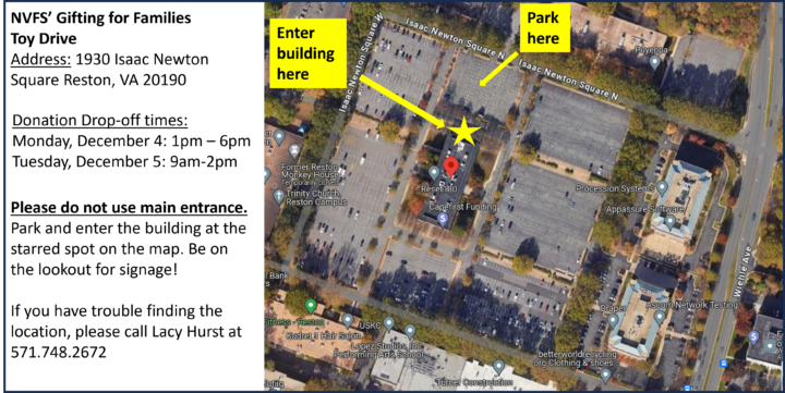 Note: When using Google Maps to navigate to the address above, it will direct you to the building’s front entrance. However, please follow the directions on the below map to reach the unloading area. You can park in the area right before entering the parking garage. You will see our NVFS sign and orange parking cones. Then enter the building through the covered and accessible sidewalk breezeway. Please come inside the building to check in at suite 100 on the main level (look for the NVFS Toy Drive sign outside of the suite). We will have volunteers on site to come back out to your car with you unload. If you have any questions or trouble finding the location, please call us at 571-748-2672.